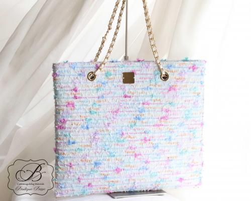 こちらは、白地にパープルやブルー、グリーン、イエローなどのの糸が素敵に混ざり合ったデザインです。